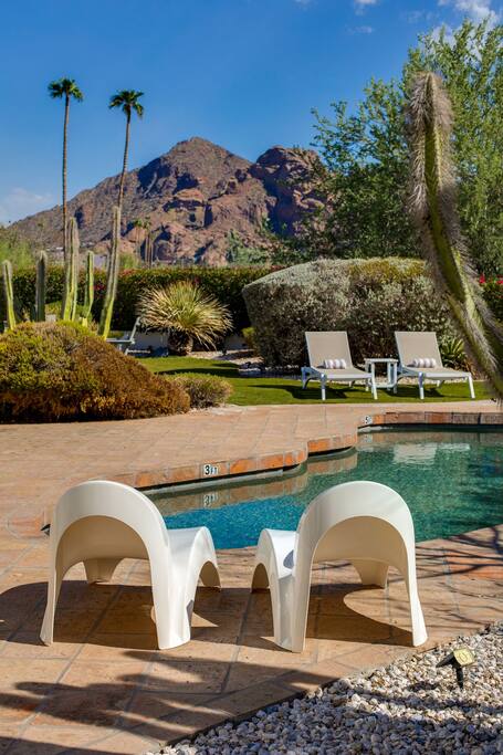 • High-style modern design with breathtaking Camelback Mountain views • Heated pool — 84º (additional fee) • 3 King Beds + 2 Full Beds (all memory foam, and no bunks or sofa beds) • Chef’s dream kitchen and a dream coffee station • Picturesque backyard with spaces for everyone to gather • Mixologist’s bar cabinet stocked with glassware & tools • Prestigious PV location — minutes from Old Town Scottsdale, Phoenix, hiking, dining & shopping
